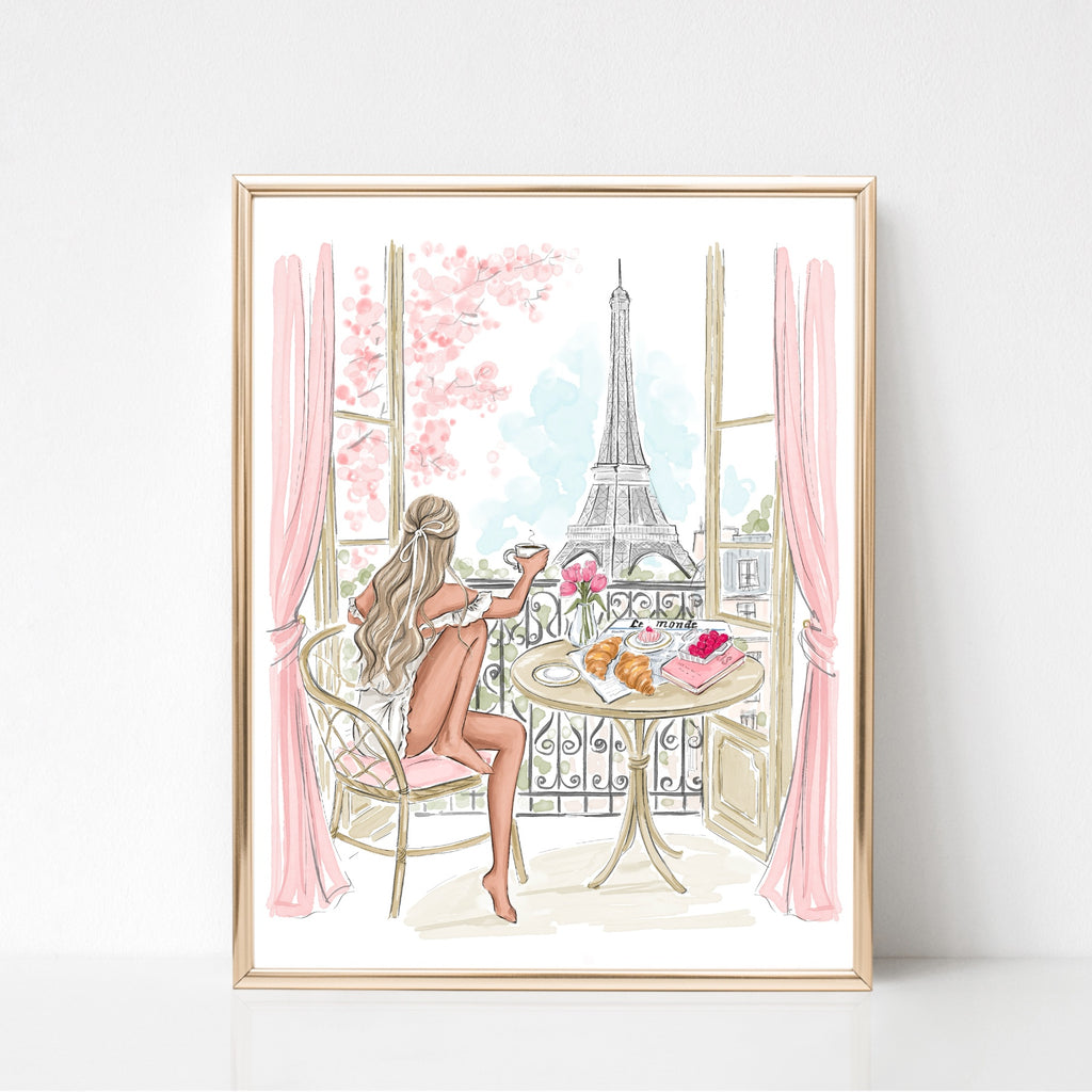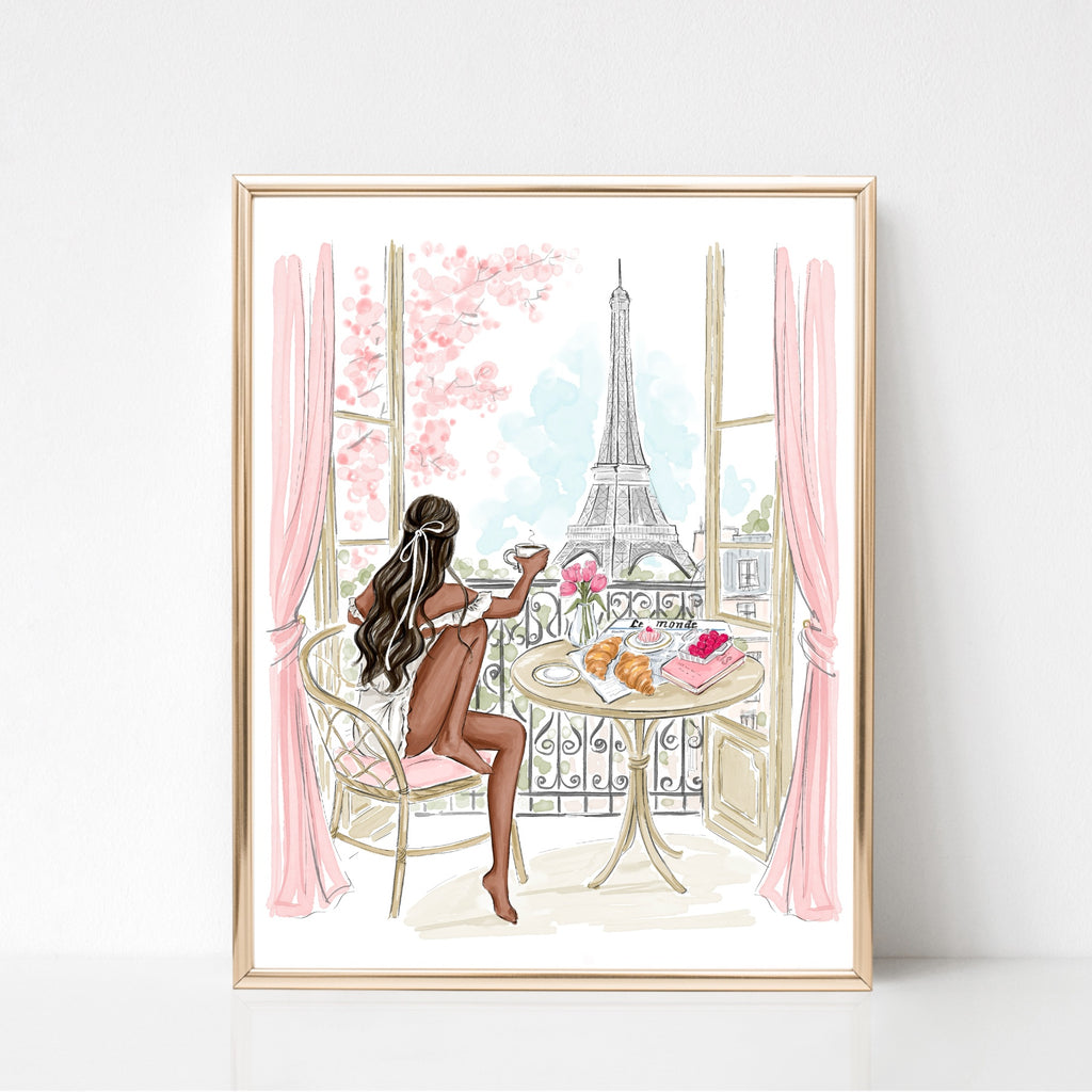 Watercolor art print fashion illustration. Morning coffee with Eiffel Tower view